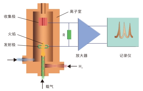 氫火焰離子化檢測器(FID),它是典型的破壞性、質(zhì)量型檢測器、是以氫氣和空氣燃燒生成的火焰為能源,當(dāng)有機(jī)化合物進(jìn)入以氫氣和氧氣燃燒的火焰,在高溫下產(chǎn)生化學(xué)電離,電離產(chǎn)生比基流高幾個(gè)數(shù)量級的離子,在高壓電場的定向作用下,形成離子流,微弱的離子流經(jīng)過高阻放大,成為與進(jìn)入火焰的有機(jī)化合物量成正比的電信號,因此可以根據(jù)信號的大小對有機(jī)物進(jìn)行定量分析。