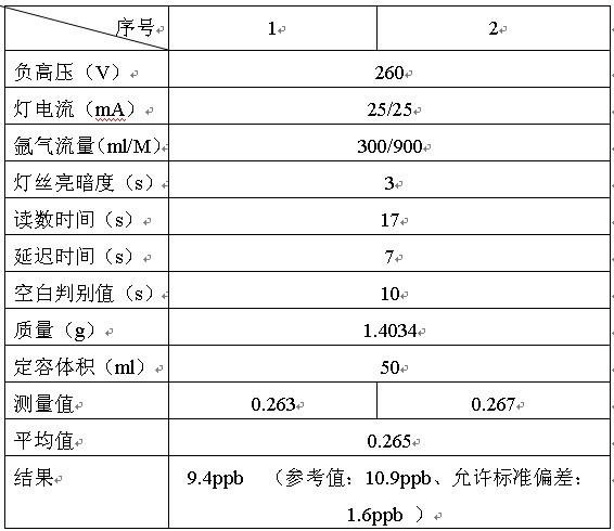 前處理:從樣品中稱量1.4034g于玻璃燒杯中,加入8ml HNO3和2mlHClO4加熱溶解(消解溫度350℃左右)。冷卻后定容于50ml容量瓶中,加入1ml HNO3,5%的重鉻酸鉀1ml。(同時做樣品空白)(還原劑加0.5%鐵氰化鉀)