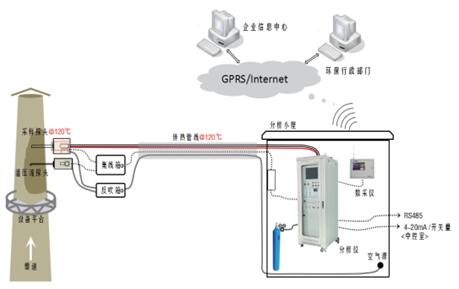 采樣探頭安裝于企業(yè)廢氣排口,排口被測廢氣被負(fù)壓抽泵抽取進入采樣探頭探桿(不加熱),經(jīng)過陶瓷濾芯進入伴熱管線(伴熱溫度可設(shè)置),樣氣在伴熱管中繼續(xù)傳輸至預(yù)處理系統(tǒng),在預(yù)處理系統(tǒng)經(jīng)過二級過濾和分流后按照一定流量送至在線氣相色譜儀(GC-FID)。在線氣相色譜儀控制內(nèi)置自動取樣平面十通閥和定量環(huán)系統(tǒng)取1mL的被測樣氣,借助載氣送入色譜柱分離和FID做定性、定量分析。分析結(jié)果通過工控機保存,并和排氣筒監(jiān)測排放參數(shù)一起通過數(shù)采儀送至環(huán)保監(jiān)控平臺。