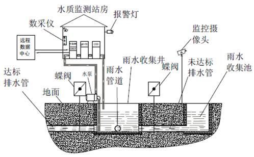 監(jiān)測系統(tǒng)控制采樣單元將水樣導(dǎo)入監(jiān)測室,并啟動監(jiān)測水質(zhì)的COD、pH、電導(dǎo)率等常規(guī)參數(shù)。達標(biāo)雨水通過電控閥門排入市政雨水管網(wǎng),一旦超標(biāo)電控閥門關(guān)閉,禁止雨水排入市政雨水管網(wǎng),并通過水泵將超標(biāo)雨水泵入企業(yè)污水處理系統(tǒng)處理,達標(biāo)后排放至市政污水管網(wǎng)。同時所有監(jiān)測數(shù)據(jù)經(jīng)由數(shù)據(jù)采集單元將數(shù)據(jù)統(tǒng)計后,由傳輸設(shè)備傳輸至企業(yè)監(jiān)測中心或環(huán)保局,由此完成對雨水排放自動、實時、連續(xù)監(jiān)控。