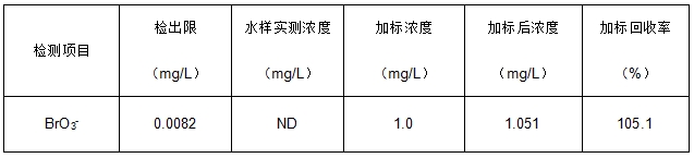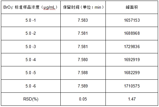 取5.0μg/mL溴酸根標(biāo)準(zhǔn)溶液重復(fù)進(jìn)樣6次,考察保留時(shí)間和峰面積的重現(xiàn)性,重現(xiàn)性結(jié)果詳見表3。